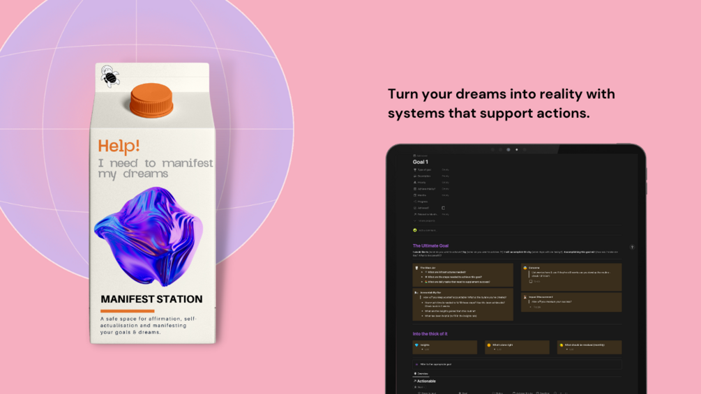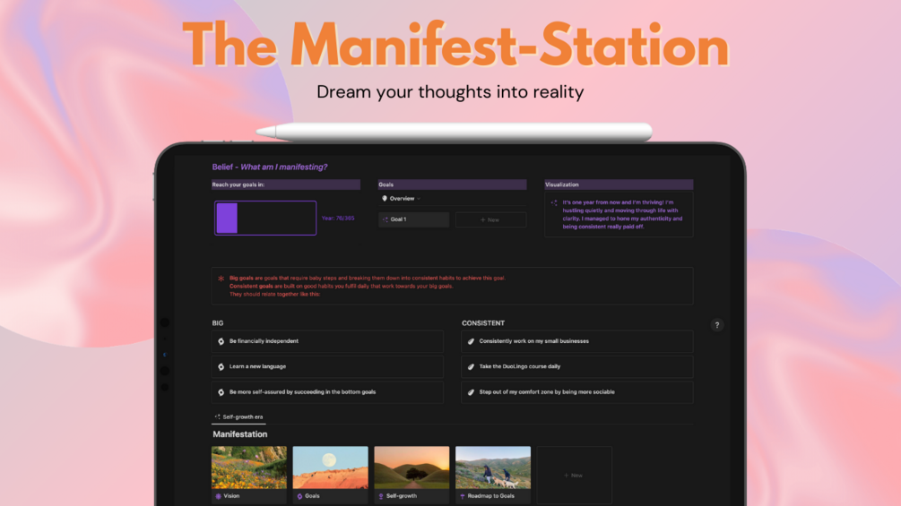 The Manifest-station is designed to help you cultivate a positive mindset, set clear goals, and take consistent action toward achieving those goals. Combining the principles of manifestation with effective planning and organization tools, its power for personal growth and transformation will be immense.